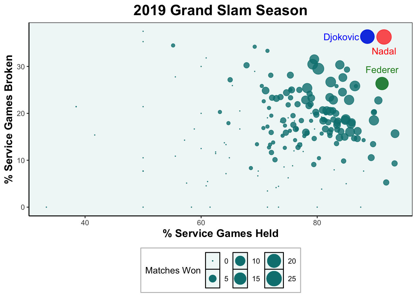 Larger bubbles are found on the top right corner of the plot. This indicates that players who are good at both defending their serve and at breaking their opponent serve tend to win more tennis matches. Unsurprisingly, since the Big 3 are good at both, their bubbles are found in the top right corner.